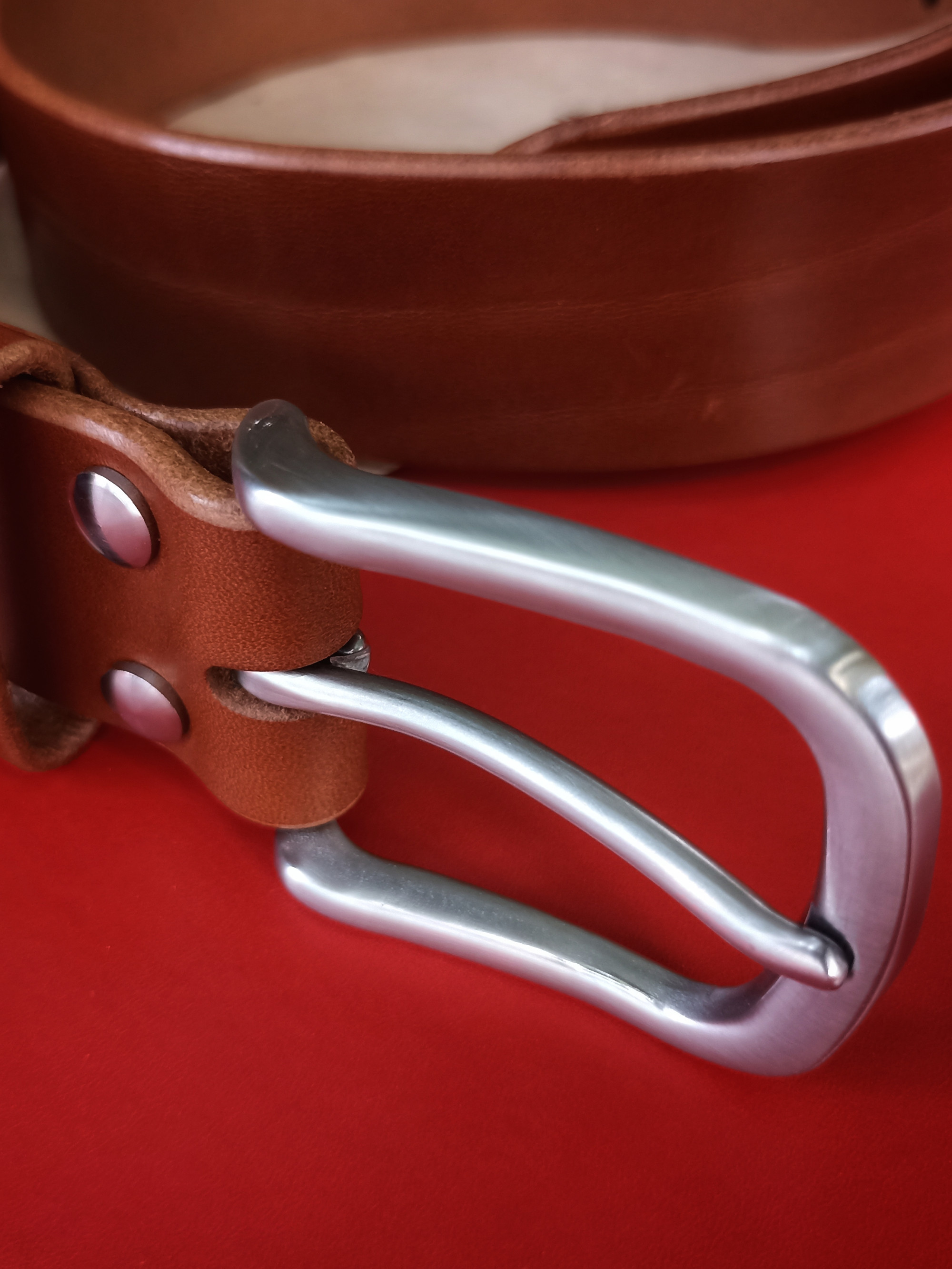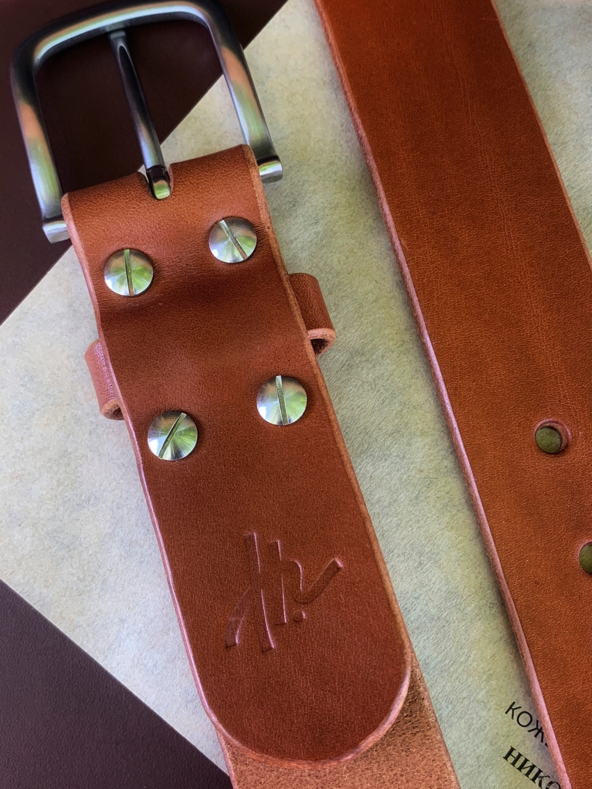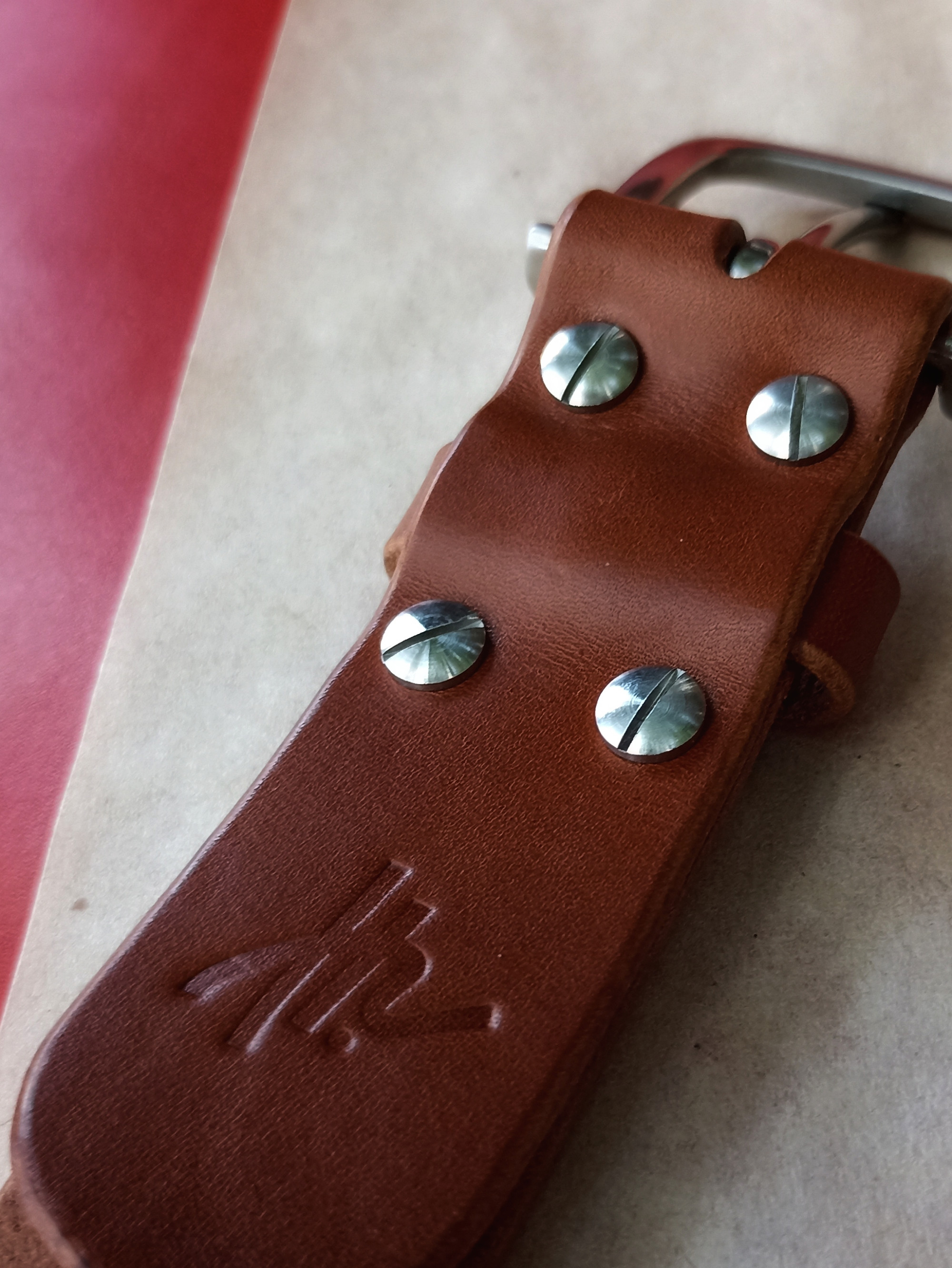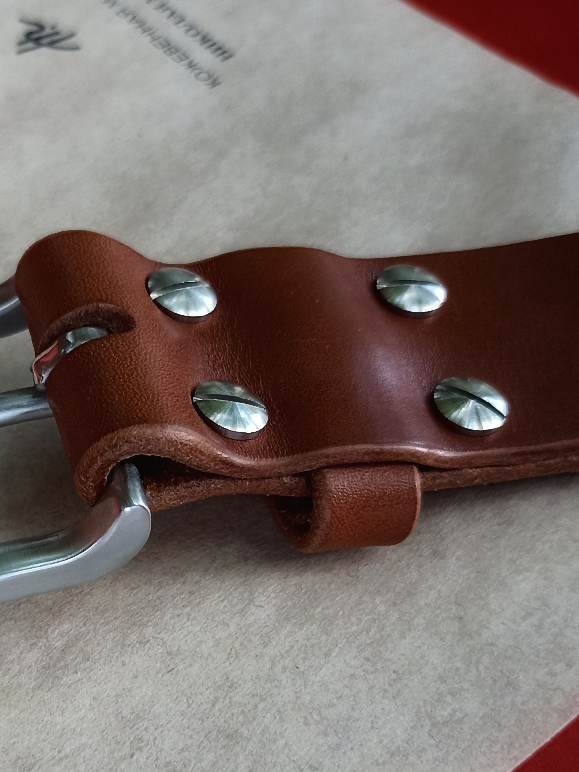 Пряжка и винты выполнены из нержавеющей стали, оттенок матовый. Винты массивные, линзообразные, в данной модели их 4. Подпряжный «язычок» для компактности и пикантности чуть тоньше основной полосы ремня.