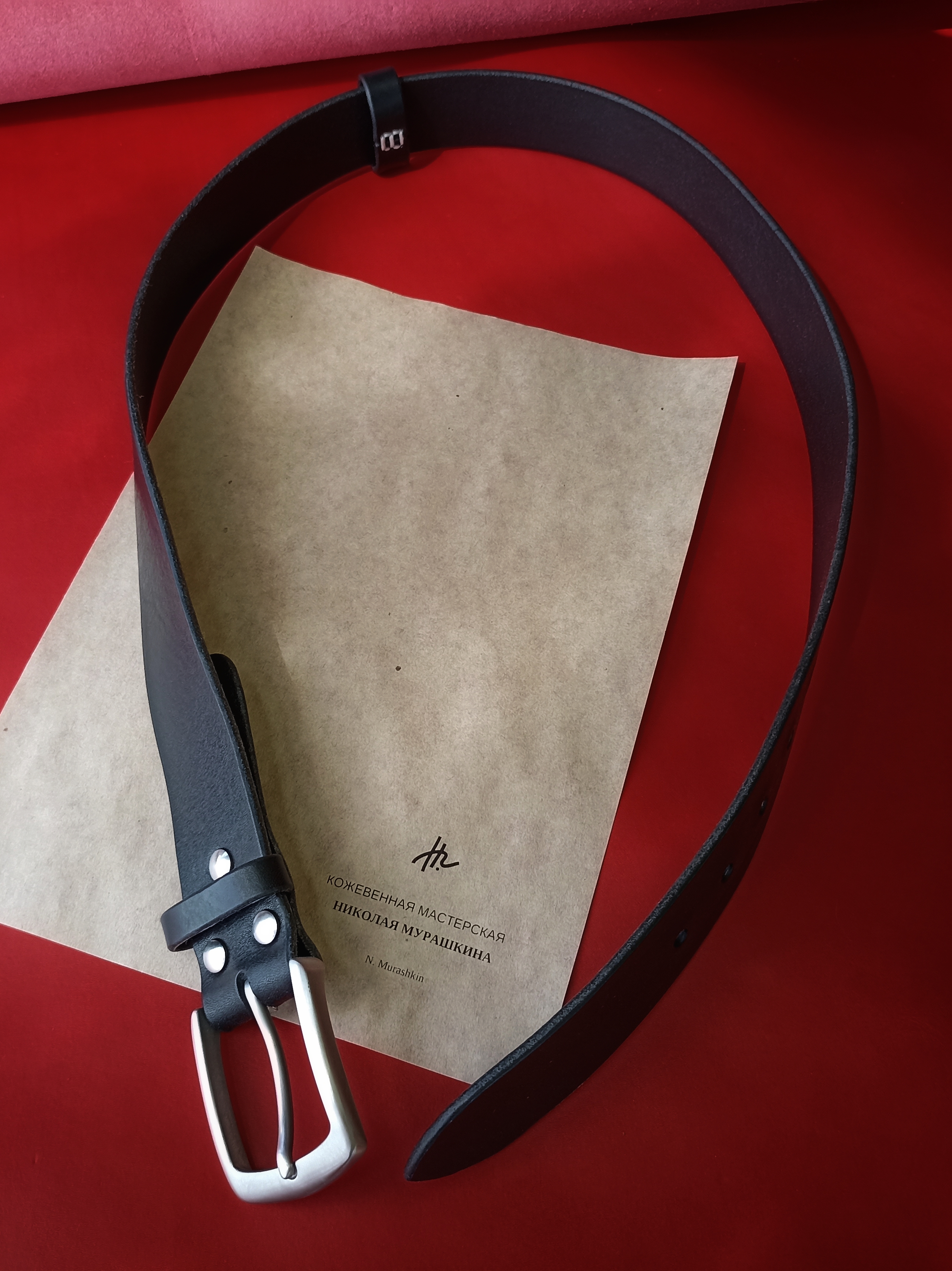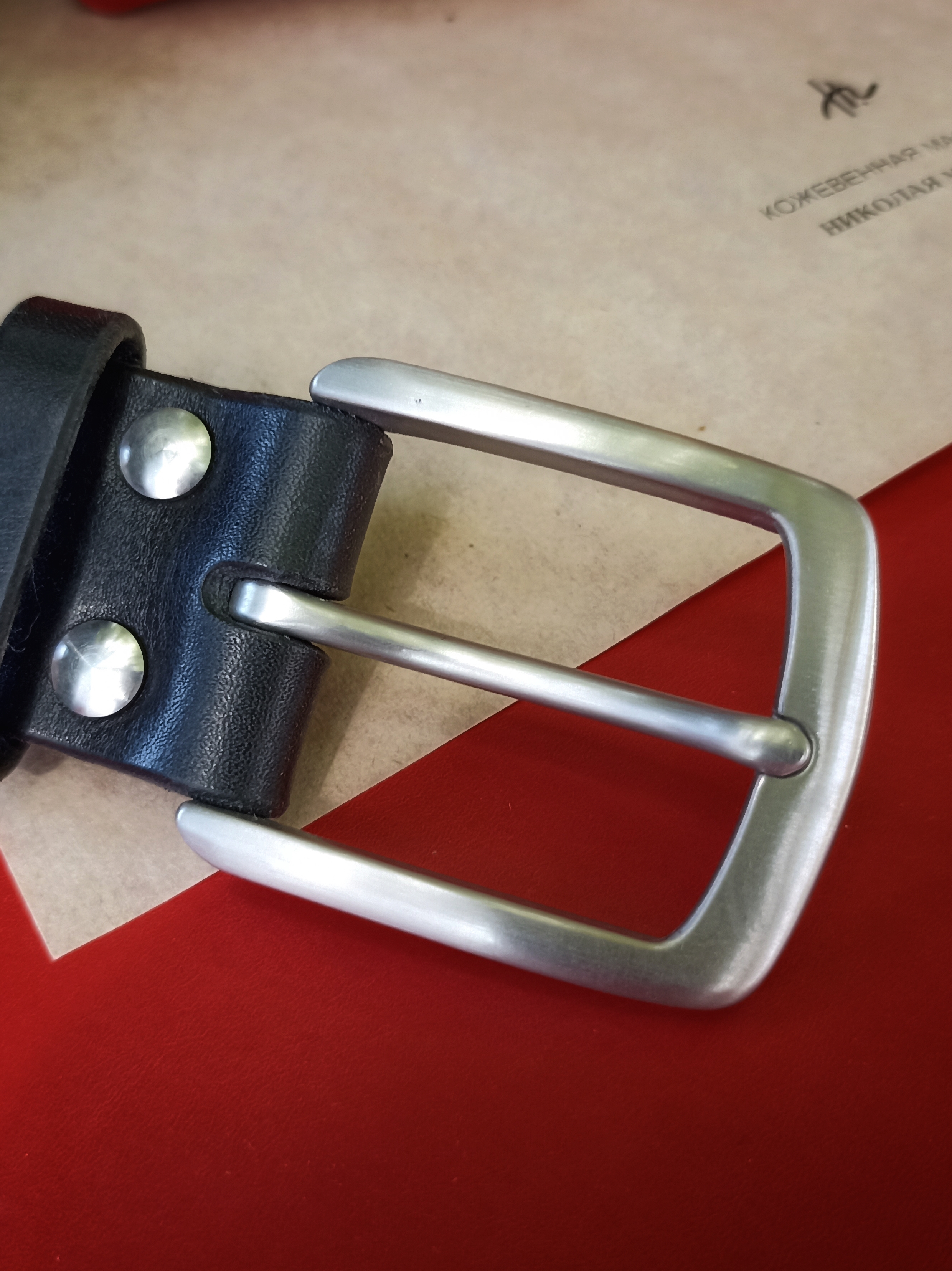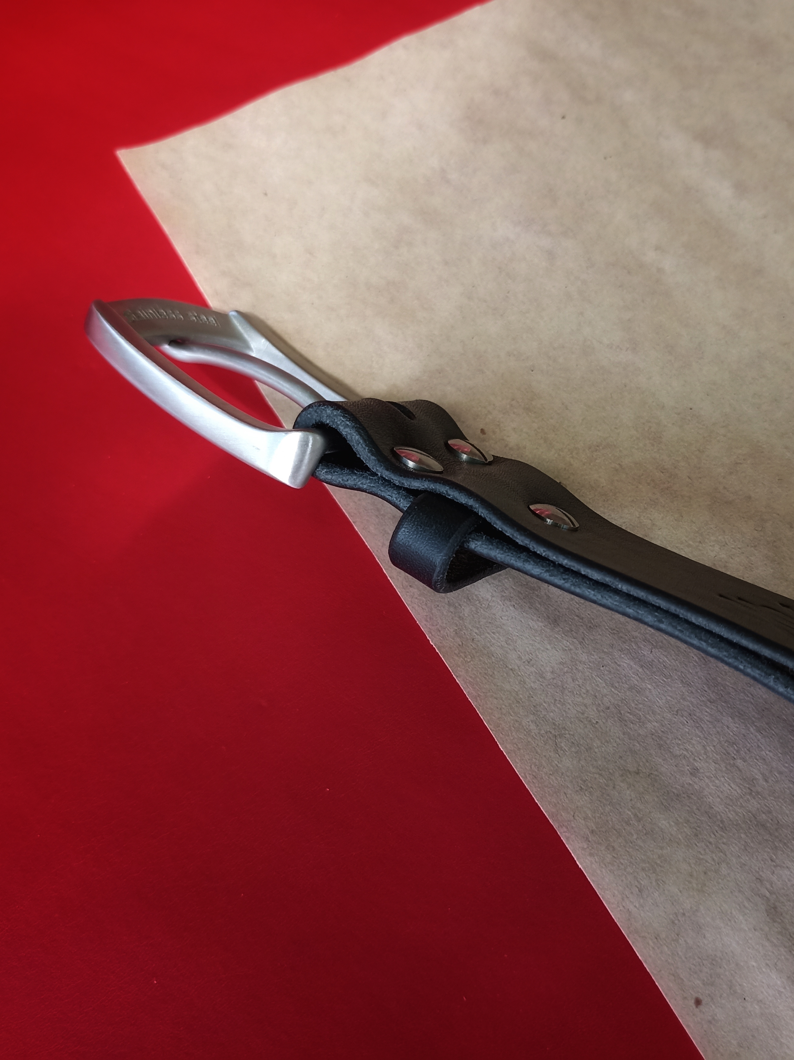 Nobel — это модель средней брутальности: ремень не сильно груб и при этом не мягок. Брутальность ремню придаёт несколько массивная угловатая матовая пряжка с 3-мя мощными винтами. В тоже время, я истончаю конец ремня под винтами почти вдвое, получая своеобразный язычок (на фото на нём виден логотип). Данное истончение делает часть ремня с пряжкой, да и ремень, в целом, чуть компактнее. Кроме того, нотку компактности ремню добавляет более узкая шлёвка в районе пряжки, когда как «гуляющая» по полосе вторая шлёвка является более широкой.