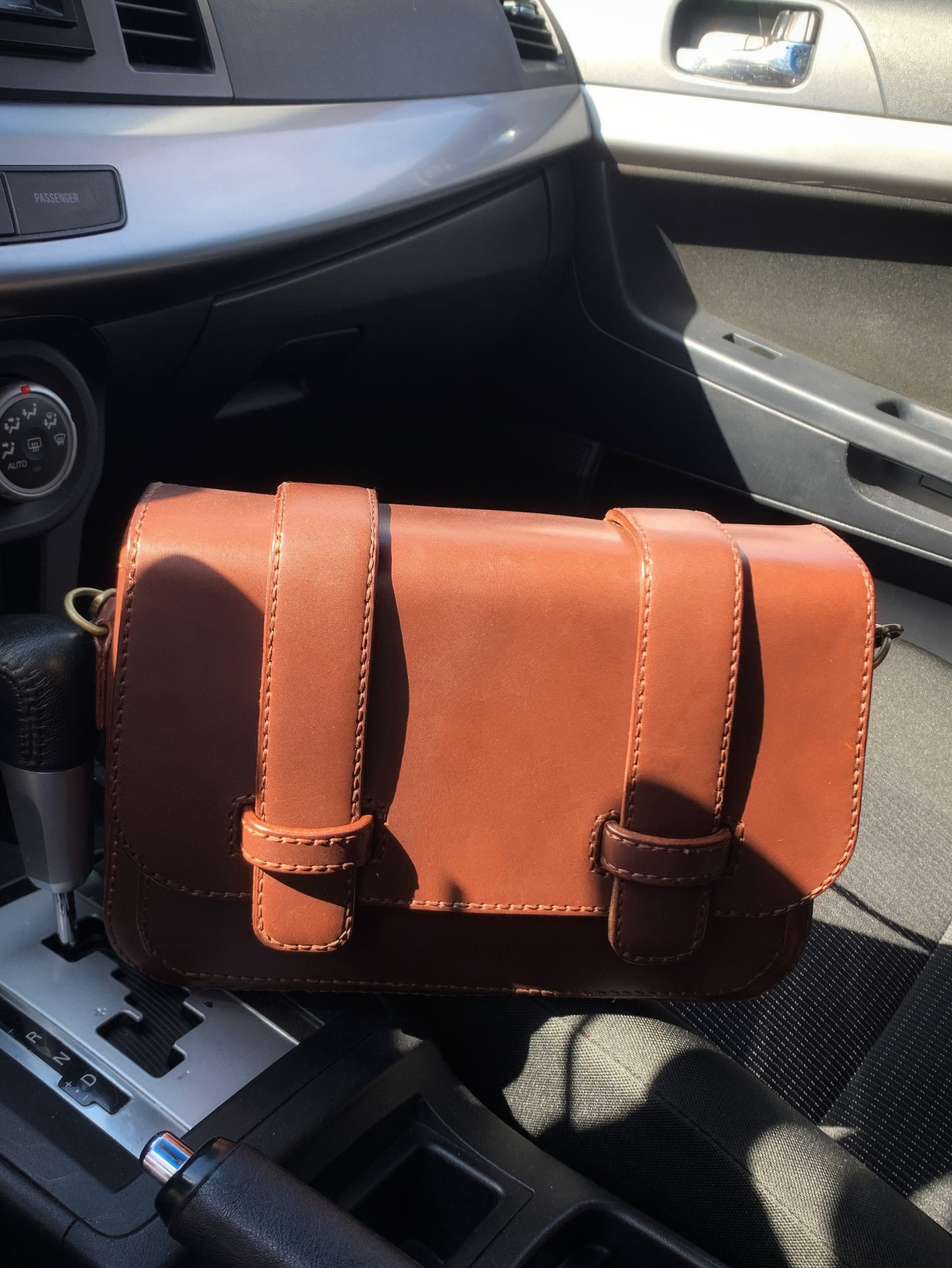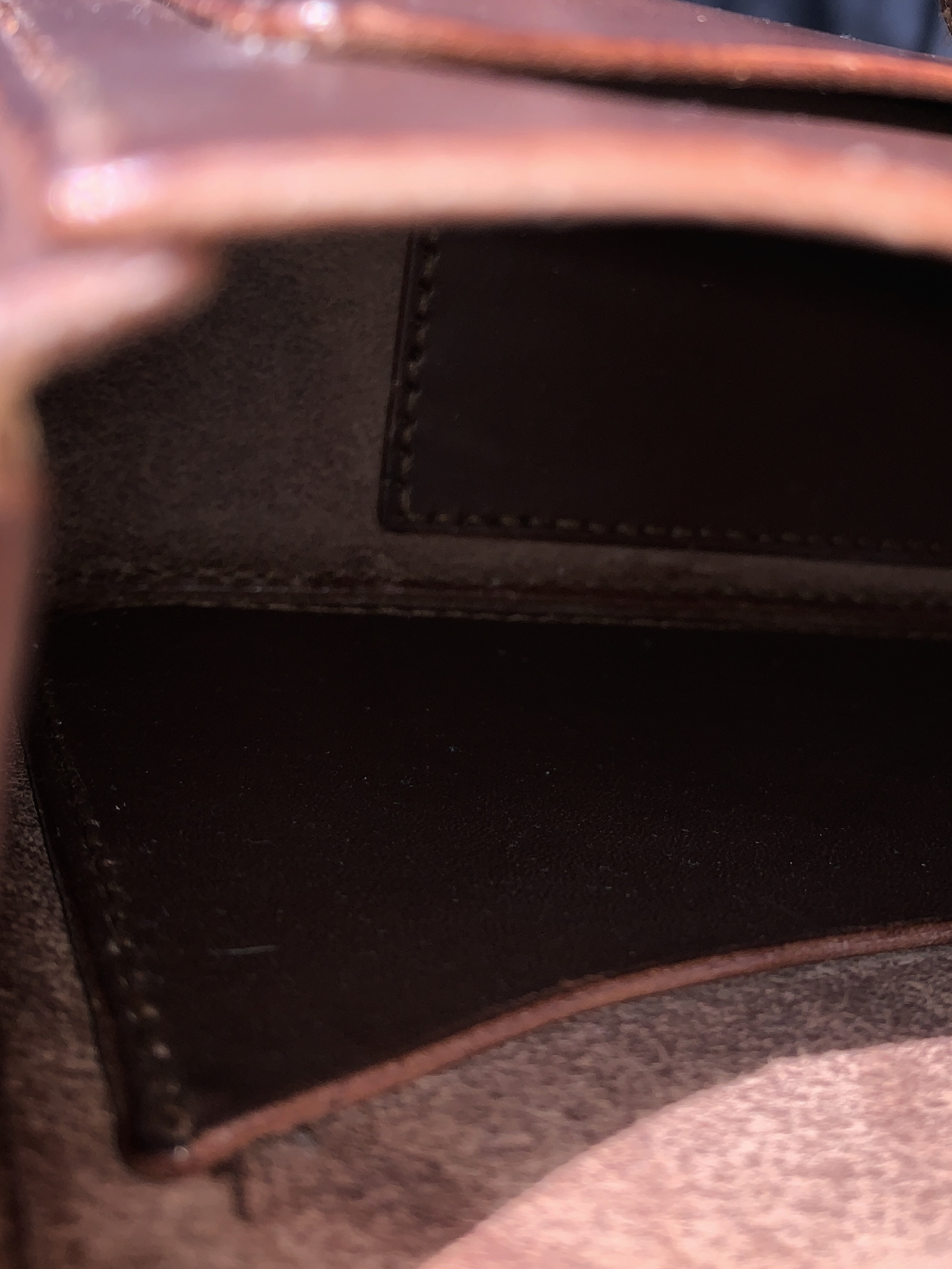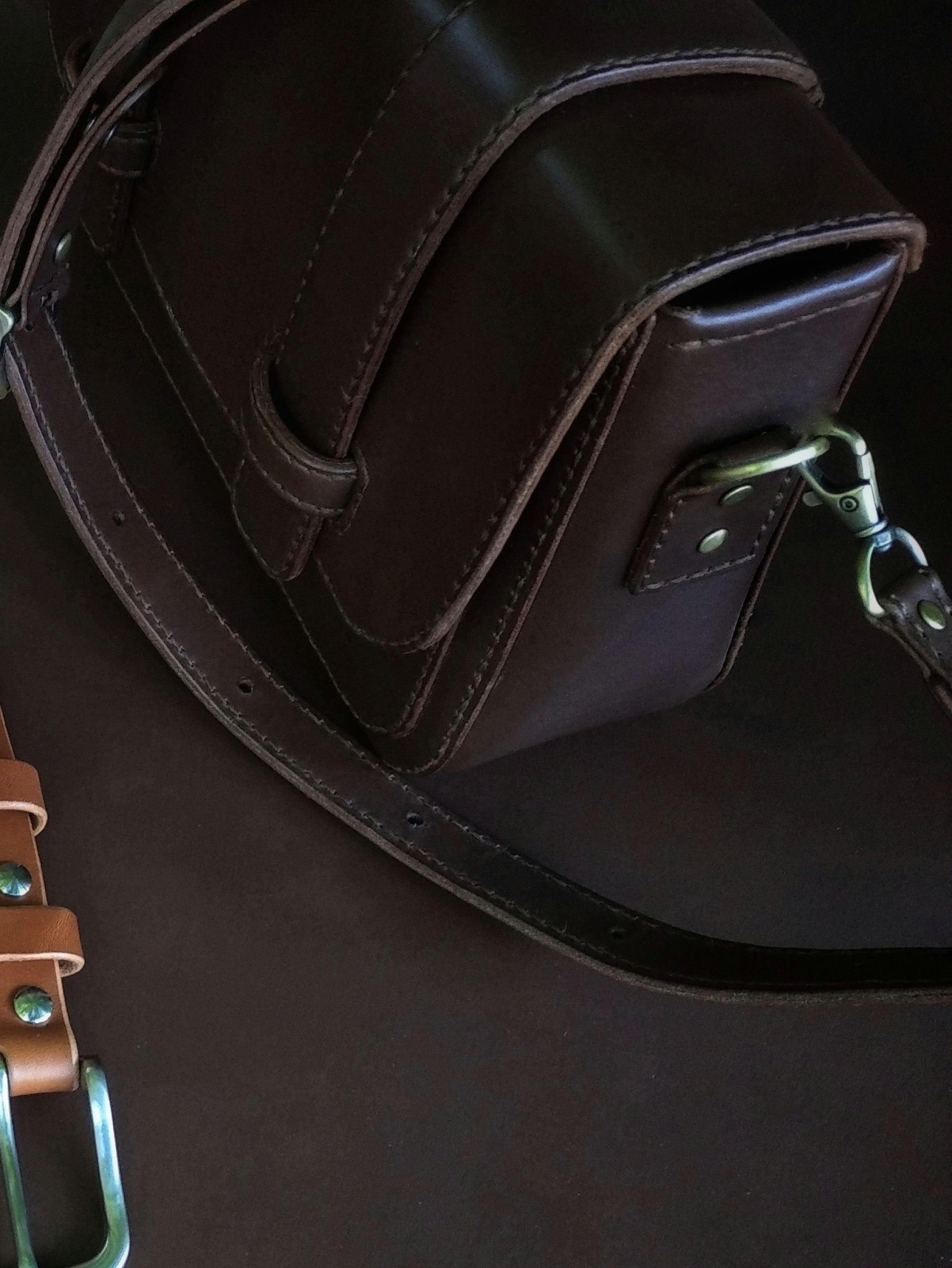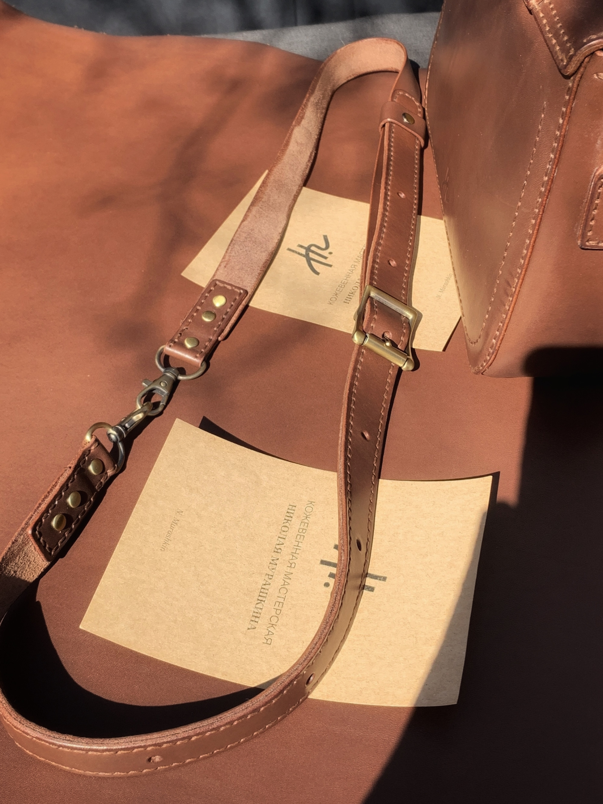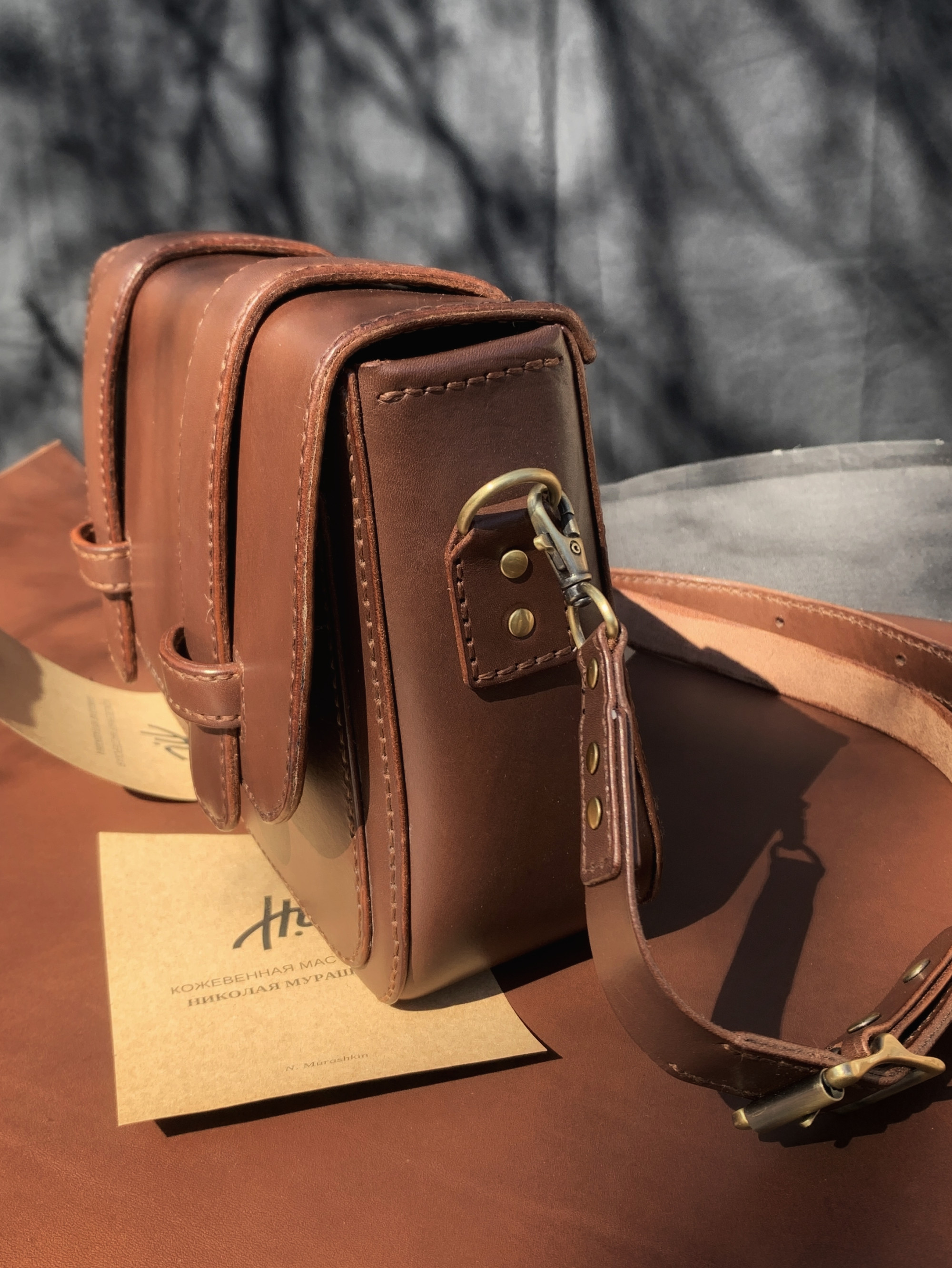 Особенность кожи — это винтажный очень глубокий цвет, который может принимать разные оттенки, в зависимости от освещения. Например, при тёплом солнечном свете кожа приобретает коричневый, близкий к светло-каштановому или даже оранжевому оттенок. При этом, при холодном освещении сумка имеет оттенок тёмно-коричневый, а в малоосвещённом помещении — даже тёмно-бордовый, близкий к цвету тёмной вишни. Эта очень интересная особенность данной кожи придаёт отдельное приятное ощущение шарма, винтажа и может какой-то гармонии с кожей... В дополнение винтажной коже в данном случае мы также использую и винтажную (античную) полированную фурнитуру.